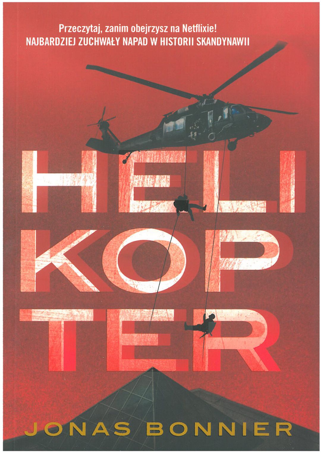 Najbardziej zuchwały napad w historii Skandynawii. Czegoś takiego Szwecja nie widziała. 22 września 2009 o 5:15 na dachu najbardziej niedostępnego budynku w Sztokholmie wylądował helikopter. Dwadzieścia minut później było już po wszystkim. Pod okiem policji i mediów skradziono 39 milionów szwedzkich koron. Pieniędzy nigdy nie odnaleziono. Czterech śmiałków z dnia na dzień trafiło na pierwsze strony gazet całego świata i stało się bohaterami. Kim byli? Jak zaplanowali ten napad stulecia? Jonas Bonniers jako jedyny dotarł do mężczyzn, którzy zorganizowali skok. Helikopter, efekt wielogodzinnych rozmów, odsłania wielomiesięczne przygotowania, oraz to, co wydarzyło się tuż po napadzie.